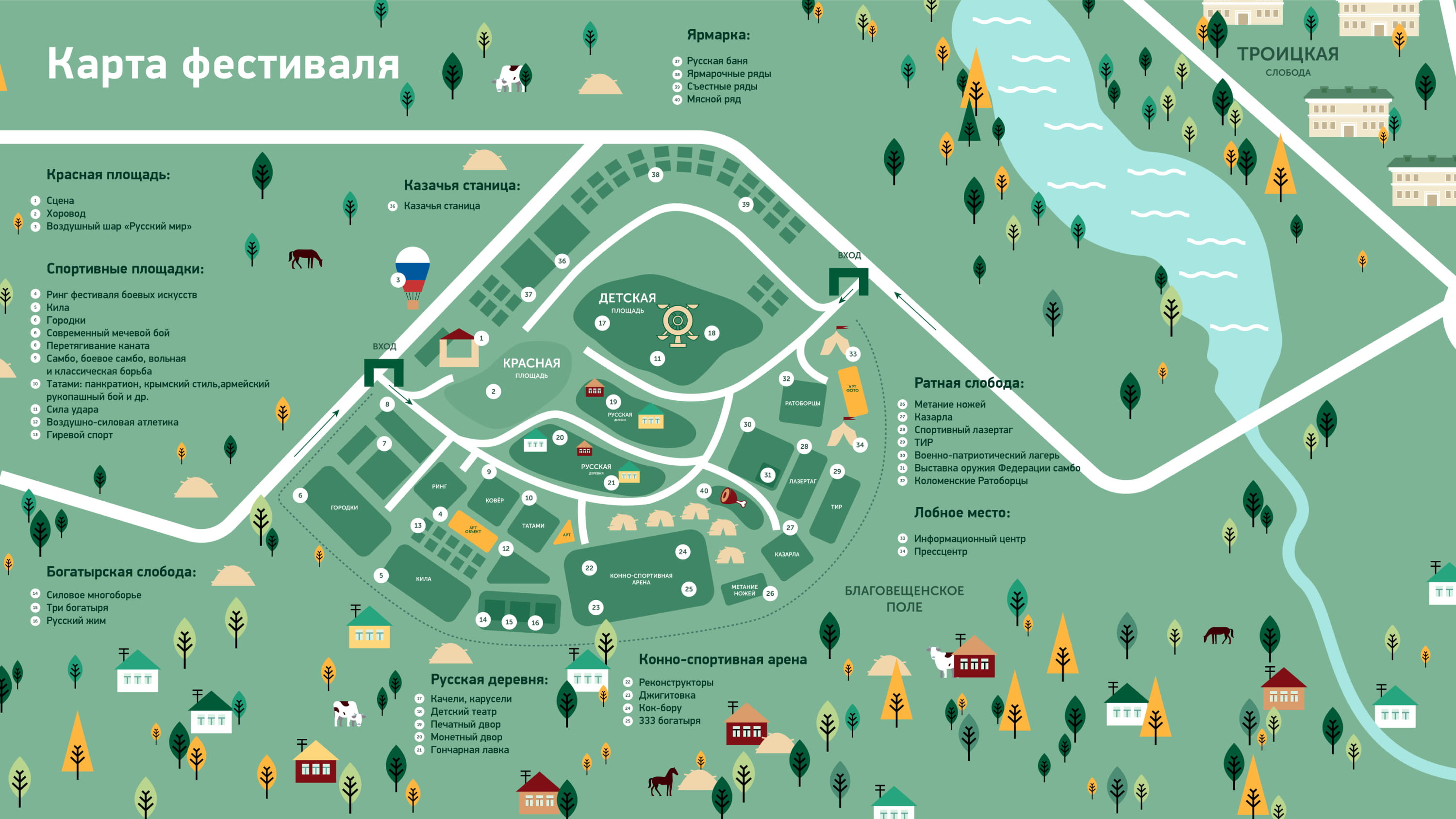 На фестивале будут проведены показательные выступления мастеров боевых искусств, матчевые встречи и турниры по комплексному единоборству, борьба на поясах, шапочный бой, мас-рестлинг, тхэквондо, боевое самбо и другие. Всего для гостей фестиваля будет представлено более 15 видов спорта.