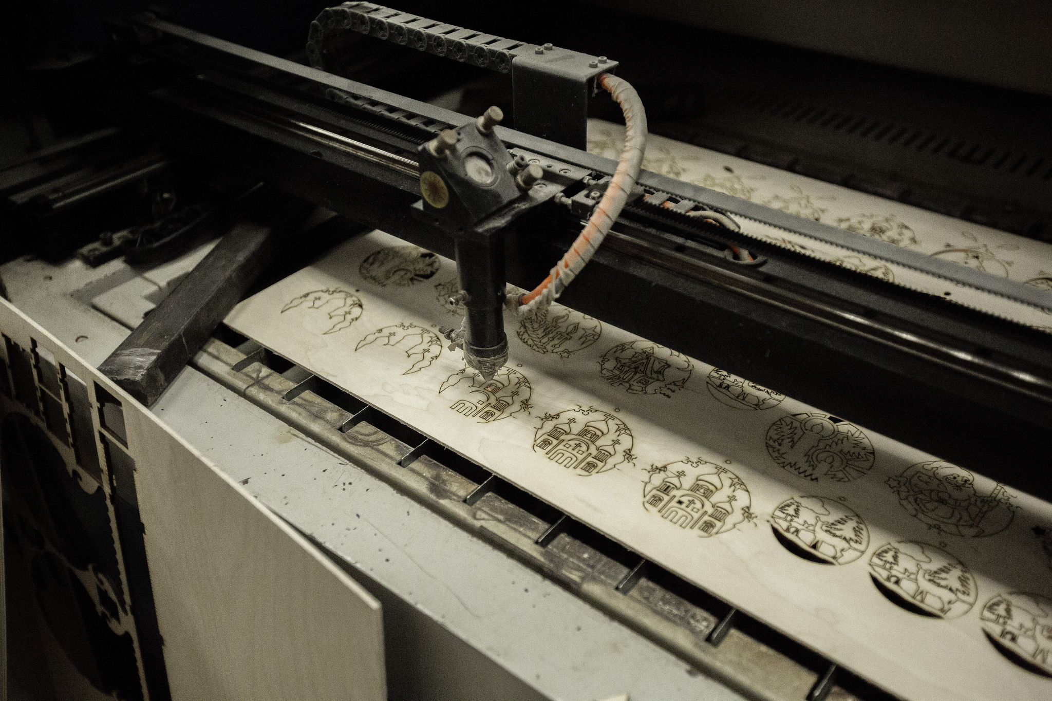 Лазер представляет собой усиленный световой пучок, который быстро и точно наносит изображения на поверхность и прорезает ее. В мастерской по изготовлению игрушек, которая находится недалеко от Водяной башни Троице-Сергиевой лавры, установлено четыре станка для лазерной резки. Каждый из них отличается возможными размерами заготовок и мощностью светового излучателя. Для обеспечения работы машин мастерская оснащена необходимыми устройствами. В качестве источника излучения в станках используются газовые лазеры. В процессе работы газовая труба сильно нагревается, отчего происходит ее износ и теряется мощность излучения. Поэтому трубу охлаждает специальный насос - чиллер - с помощью циркулирующей воды. Во время контакта лазера с поверхностью детали она плавится. Из-за этого выделяется угарный газ, который отводит наружу вытяжка через подведенные к станку трубы. Также у станков размещены воздушные компрессоры для охлаждения зоны резки во избежание воспламенения или деформации материала.