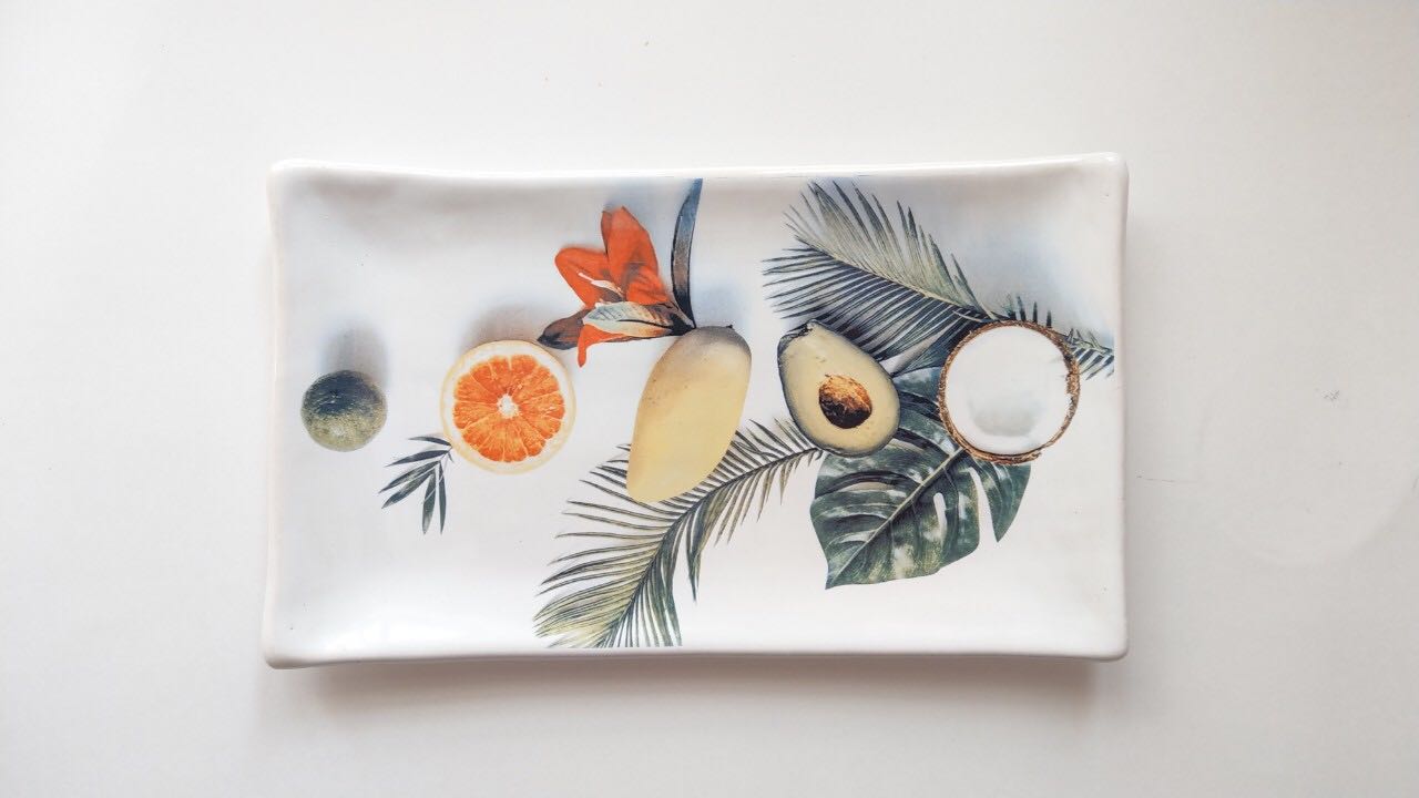 Техника нанесения изображения на посуду - деколь. На блюдцах и тарелках теперь аппетитно переливаются клубника, черника, апельсины, грейпфрут, кокосы, колосья и многое другое. Работа выполнена в современном стиле с использованием ярких и живых красок.