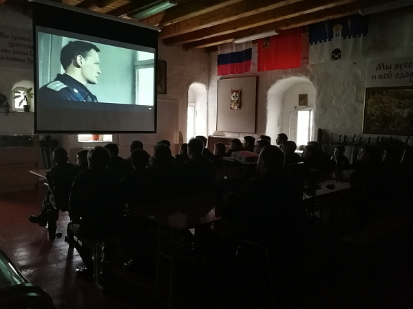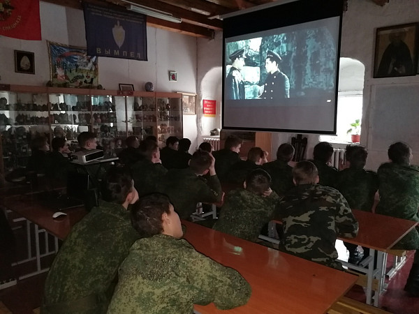 Урок по истории был совмещен с просмотром фильма Владимира Рогового «Юнга Северного флота» (1973 г.). Фильм основан на реальных событиях Великой Отечественной войны и рассказывает о четырех подростках, поступивших в созданную в 1942 году на Соловецких островах Школу юнг ВМФ. Курсанты смотрели фильм с удовольствием, сопереживая героям, понимая и юмор, и эмоциональный накал фильма.