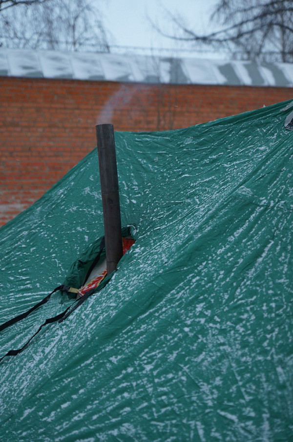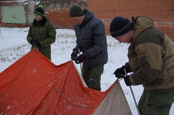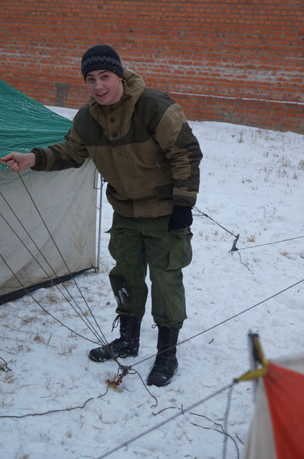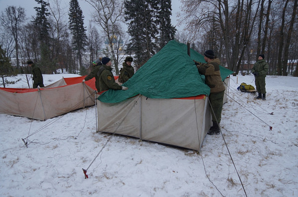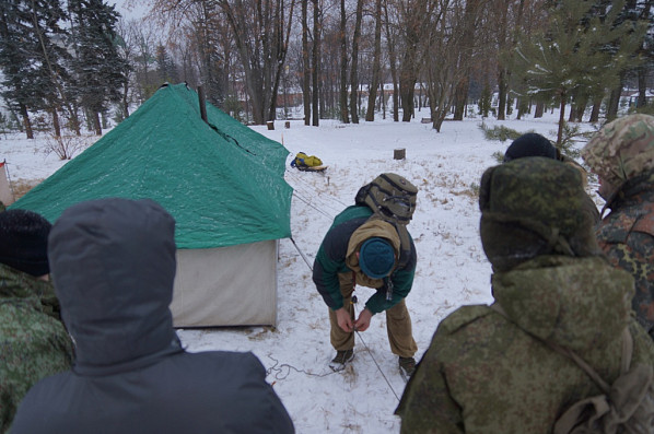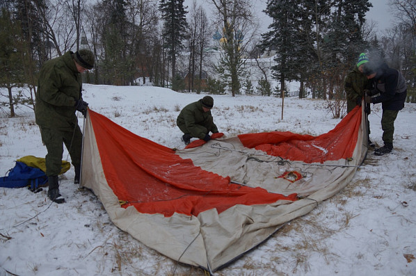 Перебазировавшись в лаврский Пафнутьев сад, курсанты демонстрировали практические навыки установки палаток, заодно проверяли их комплектность и целостность. Поскольку поход предстоит зимний, в палатке установили походную печку и затопили ее.