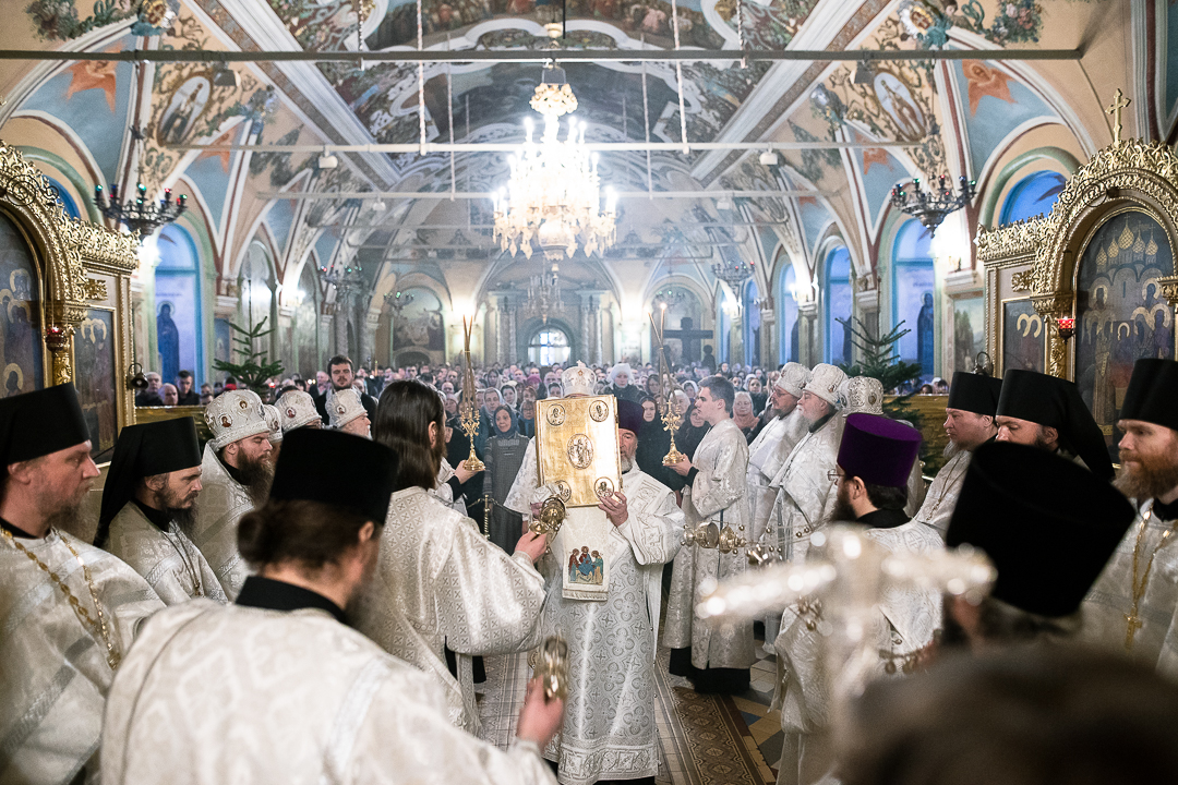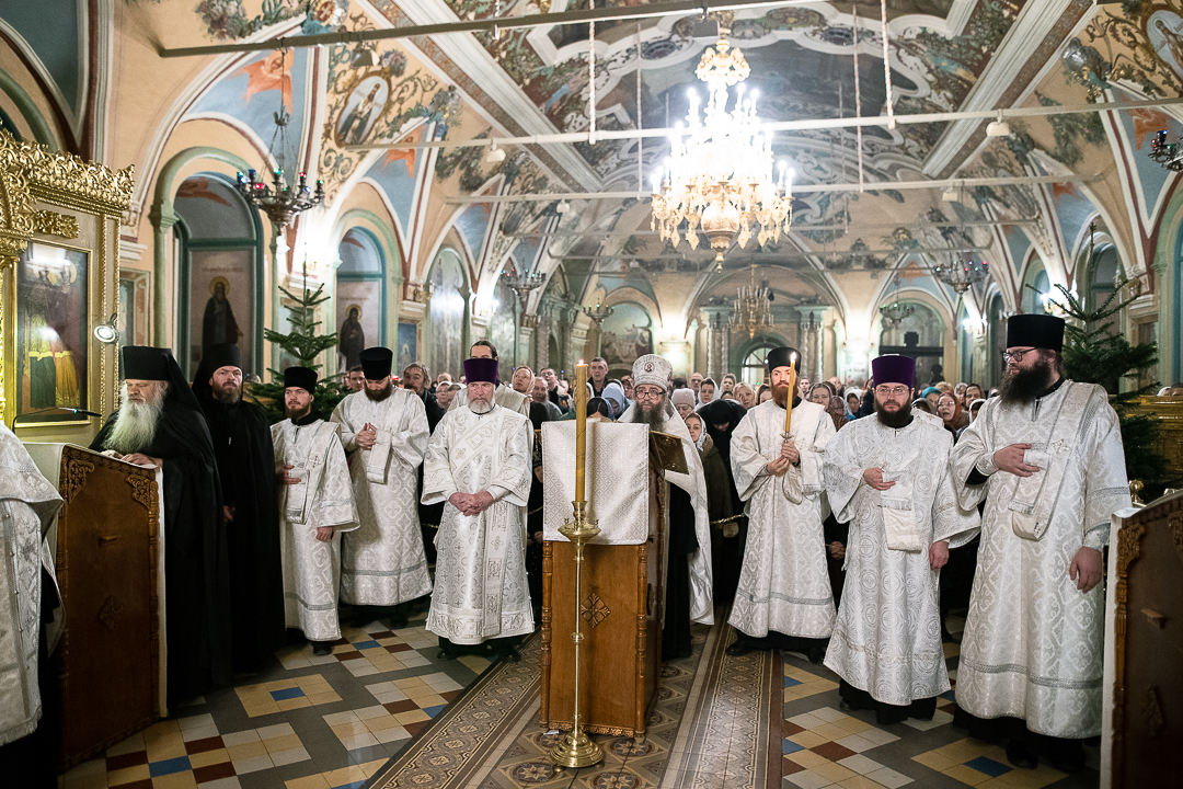 Богослужения Нáвечерия Рождества Христова в Сергиевском Трапезном храме Лавры совершил наместник Лавры епископ Сергиево-Посадский Парамон в сослужении братии монастыря в священном сане.