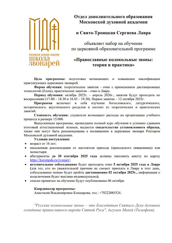 Свято-Троицкая Сергиева Лавра и Отдел дополнительного образования Московской духовной академии объявляют набор на обучение по церковной образовательной программе «Православные колокольные звоны: теория и практика».