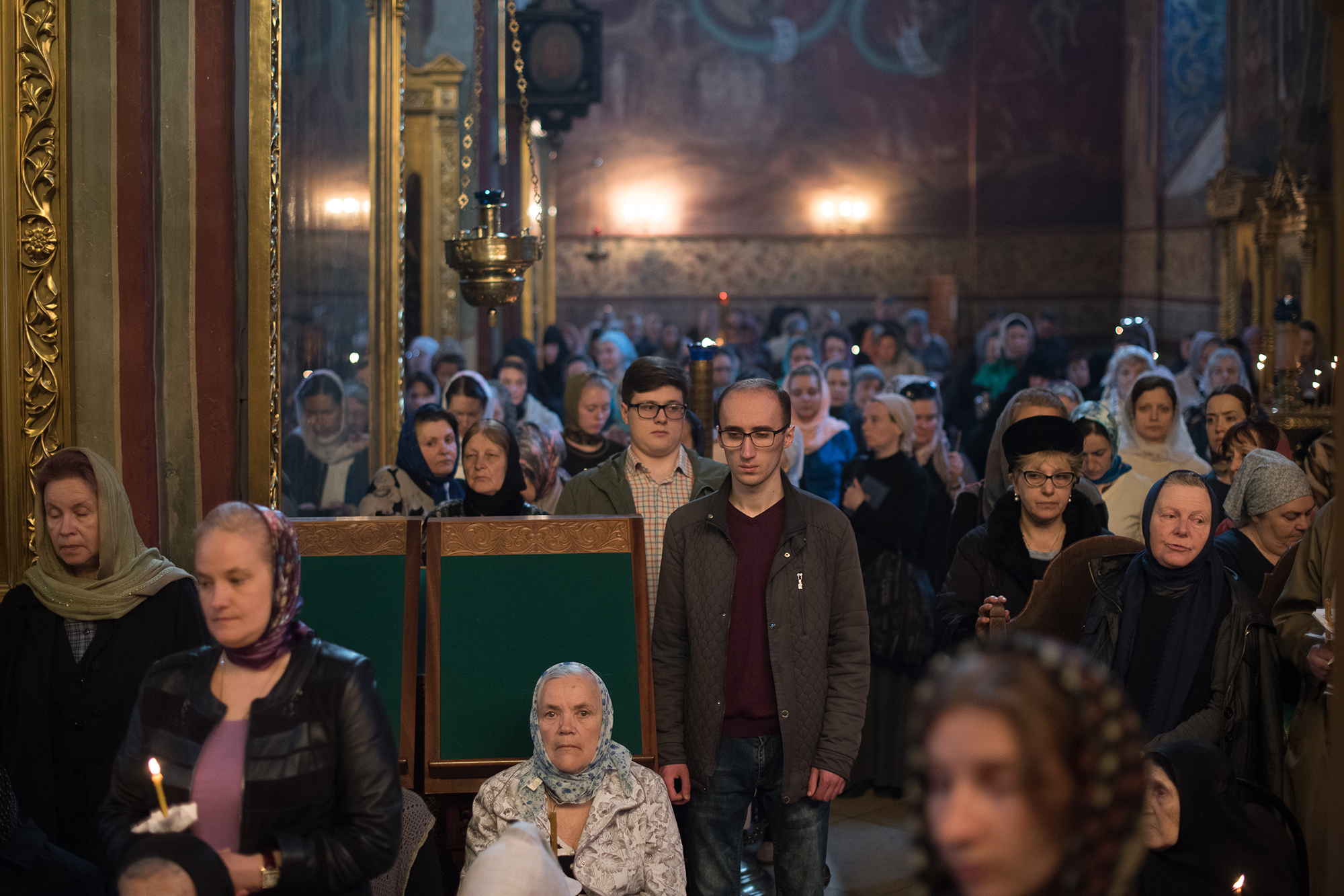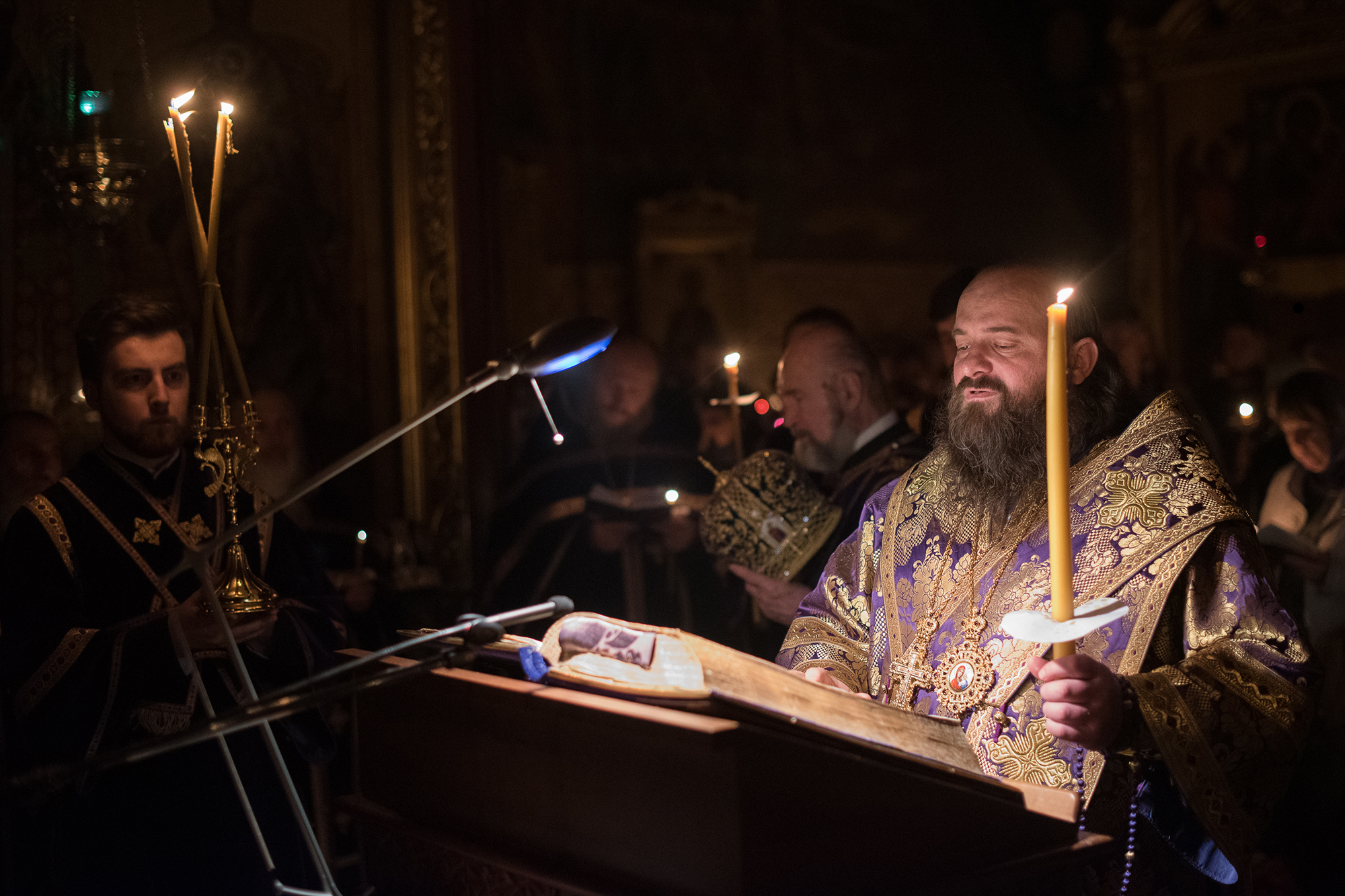 Духовенство, читающее Страстные Евангелия на утрене Великого Пятка в Успенском соборе Троице-Сергиевой Лавры: