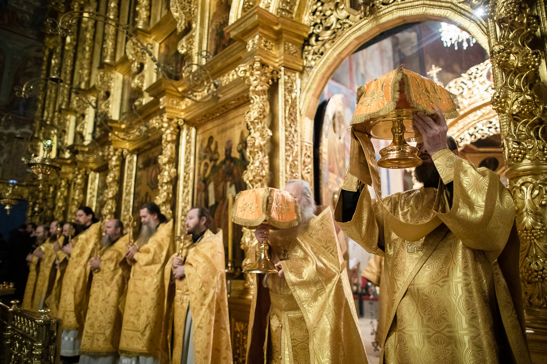 Раннюю Литургию в Успенском соборе Лавры возглавил архимандрит Иоанн в сослужении братии обители в священном сане.