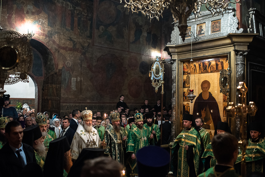 В Троицком соборе у мощей преподобного Сергия всенощное бдение совершил Святейший Патриарх Кирилл. Ему сослужили: митрополит Виленский и Литовский Иннокентий, митрополит Бориспольский и Броварской Антоний, наместник Лавры епископ Сергиево-Посадский Парамон, епископ Павлово-Посадский Фома.