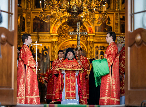 По окончании Литургии епископ Сергиево-Посадский и Дмитровский Кирилл от лица братии обители приветствовал Предстоятеля Русской Церкви и преподнес Его Святейшеству пасхальное яйцо.