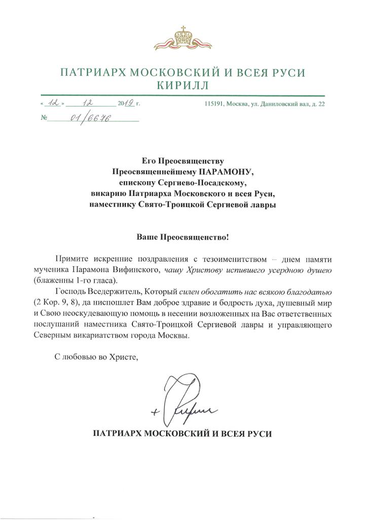 12 декабря, в день памяти мученика Парамона, наместник Лавры епископ Сергиево-Посадский Парамон отмечает день тезоименитства. Святейший Патриарх Кирилл поздравил наместника с праздником.