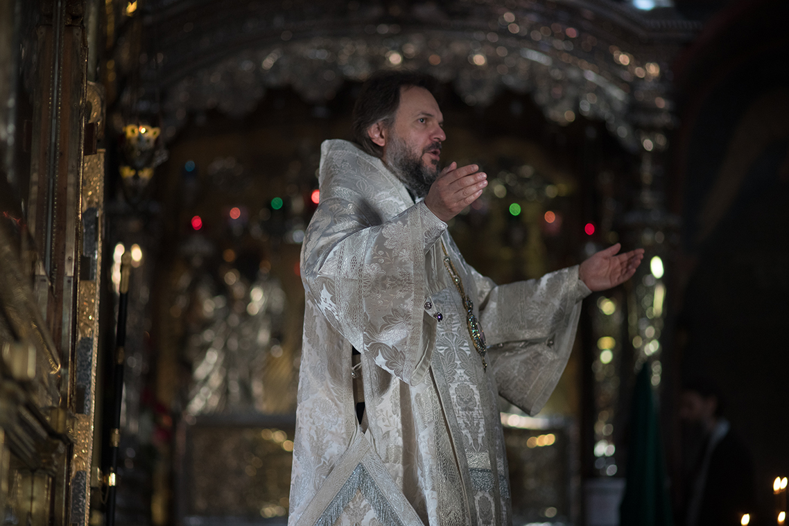 На богослужении пел знаменный хор Троице-Сергиевой Лавры под управлением иеромонаха Зиновия (Бубякина).