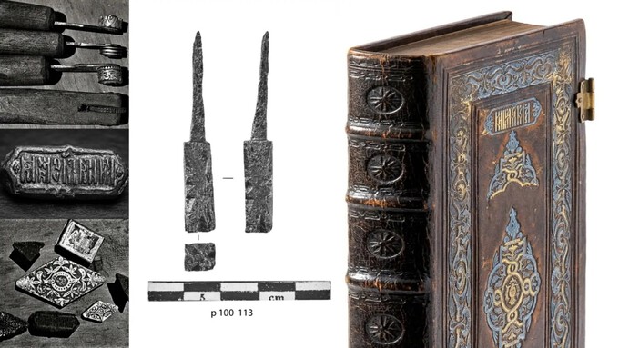 «Троицкая обитель, как и многие монастыри, была одним из центров книжной культуры, где хранили книги и переписывали их. Созданную рукопись сразу «обряжали» в переплет. Крышки переплета изготавливали из досок и покрывали телячьей кожей. Затем кожаные переплеты украшались орнаментом, сделанным при помощи тиснения горячим способом, при котором иногда применяли позолоту. Работа мастера с такими переплетами была сложной, ведь орнамент на крышке создавался с помощью целого набора специальных штампов», — объяснил научный сотрудник экспедиции Алексей Алексеев.