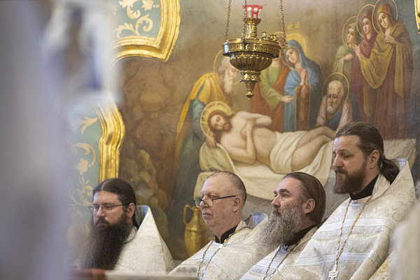 Гости обители в священном сане приняли участие в Литургии в Трапезном храме Лавры, которую возглавил архимандрит Евстафий (Солнцев). За богослужением пел хор под управлением игумена Антония (Зинина).