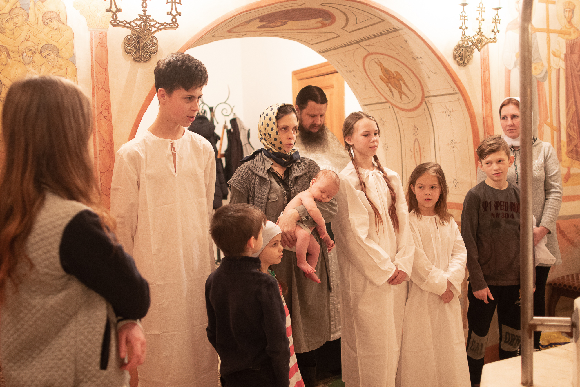 Совершил Таинство Крещения иеромонах Спиридон (Подшибякин). В крещении детям нарекли имена в честь святых: равноап. кн. Владимира, мч. Ники, мч. Валентины, кн. Ростислава Киевского.