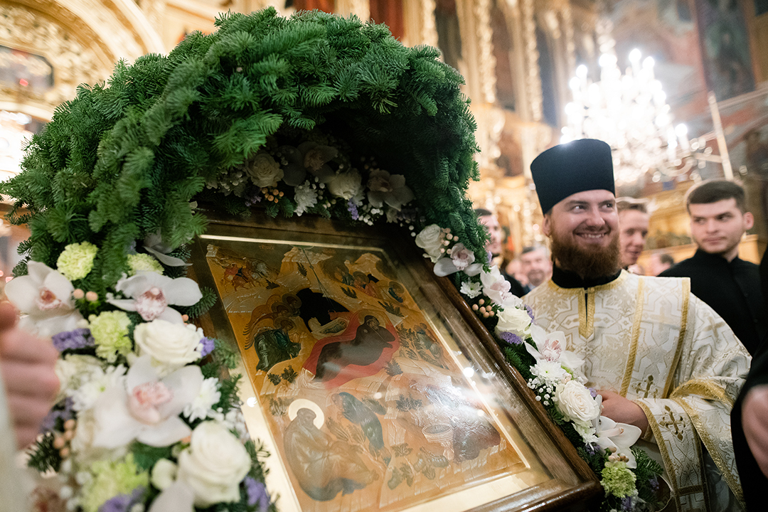 После причащения мирян наместник в сослужении братии обители в священном сане совершил пение тропаря и кондака перед иконой праздника, а затем обратился с архипастырским словом ко всем присутствующим: