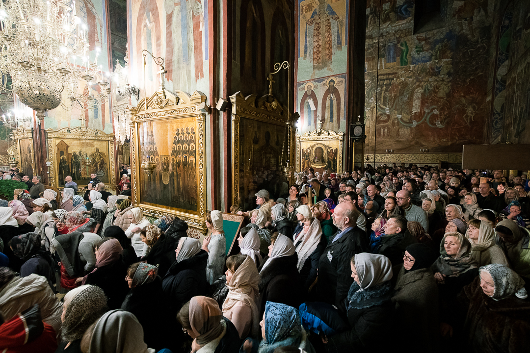 На всенощном бдении пели два состава братского хора под управлением архимандрита Глеба (Кожевникова) (правый хор) и под управлением Сергея Сухарева (левый хор).