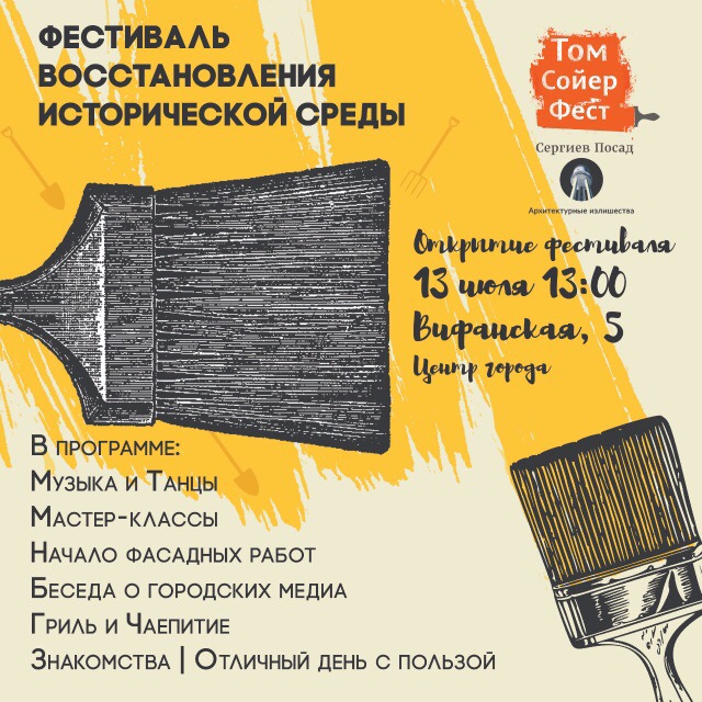 С 13 июля по 31 августа в Сергиевом Посаде при поддержке администрации Сергиево-Посадского района и Московского областного отделения ВООПИиК (Всероссийского общества охраны памятников истории и культуры) пройдет фестиваль восстановления исторической среды «Том Сойер Фест». Свято-Троицкая Сергиева Лавра вместе с Загорским трубным заводом входят в число региональных партнеров фестиваля.