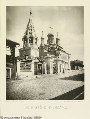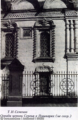 Не сохранившаяся до наших дней церковь прп. Сергия в Пушкарях представляла собой пятиглавый храм с шатровой колокольней и трапезной. Первое упоминание о ней связано с пожаром 1547 года.