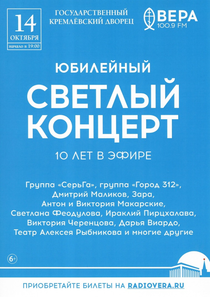 14 октября 2024 года, в праздник Покрова Пресвятой Богородицы, в Большом зале Государственного Кремлевского дворца состоится «Светлый концерт», посвященный 10-летию вещания радиостанции «Вера».