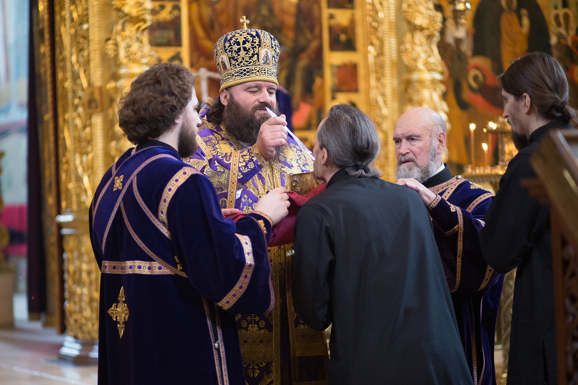 Евхаристия в дни Великого поста совершается только в субботу и в воскресенье. По средам и пятницам служится Литургия Преждеосвященных Даров. На ней нет освящения хлеба и вина и их пресуществления в Тело и Кровь Христовы. Святые Дары заготовляются заранее, в воскресенье. Поэтому и Литургия, на которой они используются, называется Преждеосвященных, то есть, освященных заранее, Даров. Сегодня, первый раз в этом году и в этот Великий пост, ее совершил епископ Сергиево-Посадский Парамон. Ему сослужила братия обители.