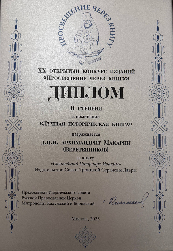 В ходе церемонии диплом II степени в номинации «Лучшая историческая книга» был вручен архимандриту Макарию (Веретенникову), насельнику Свято-Троицкой Сергиевой Лавры, доктору церковной истории, профессору Московской духовной академии, за книгу «Святейший Патриарх Иоаким».