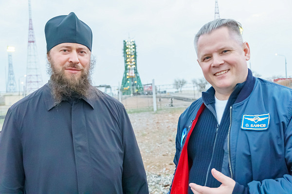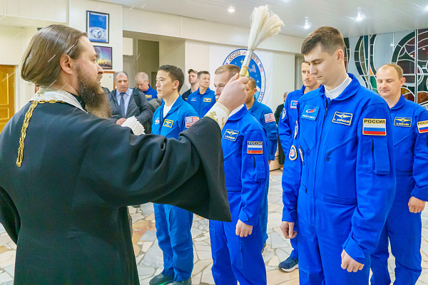 В сам день старта непосредственно перед отправлением на стартовую площадку иеромонах Пафнутий (Фокин) и иерей Даниил благословили членов основного и дублирующего экипажей в здании учебно-тренировочного комплекса ЦПК, соборно помолились и окропили всех святой водой.