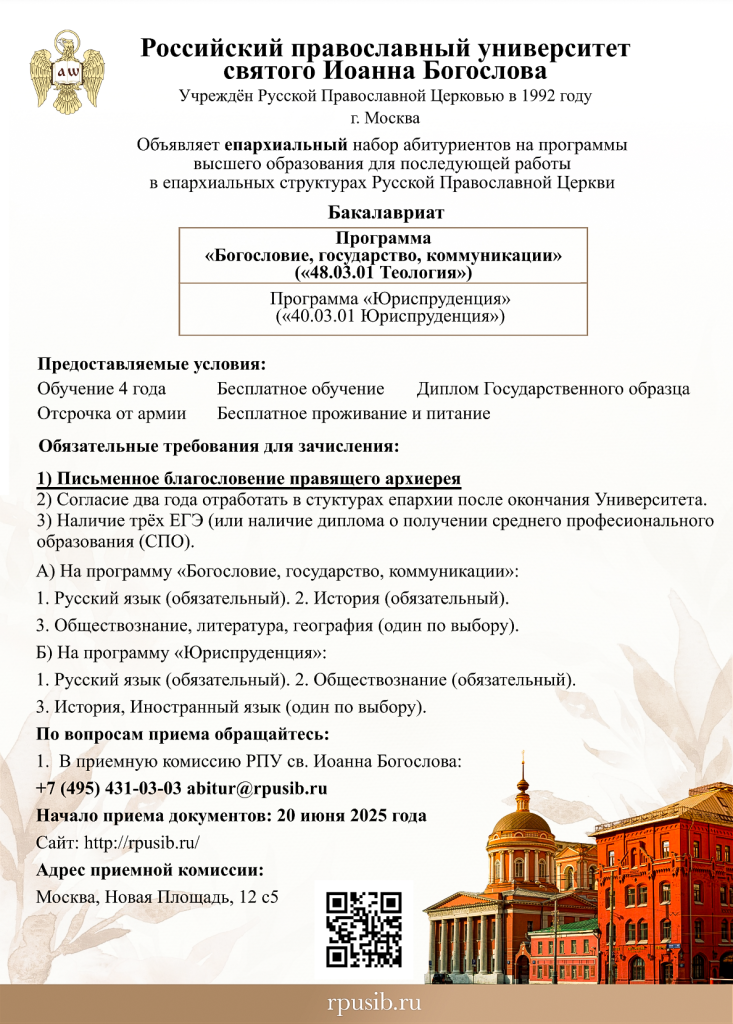 В 2025 году Российский православный университет святого Иоанна Богослова проводит набор на богословский факультет (специализация «государственно-церковные отношения и масс-медиа») и на юридический факультет (специализация «епархиальный юрист»).