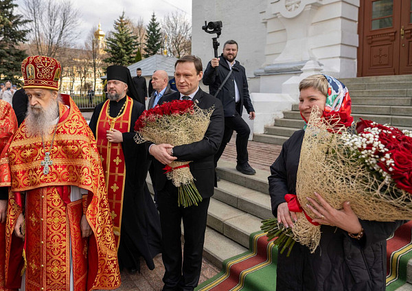 По окончании Литургии епископ Сергиево-Посадский и Дмитровский Кирилл от лица братии обители приветствовал Предстоятеля Русской Церкви и преподнес Его Святейшеству пасхальное яйцо.
