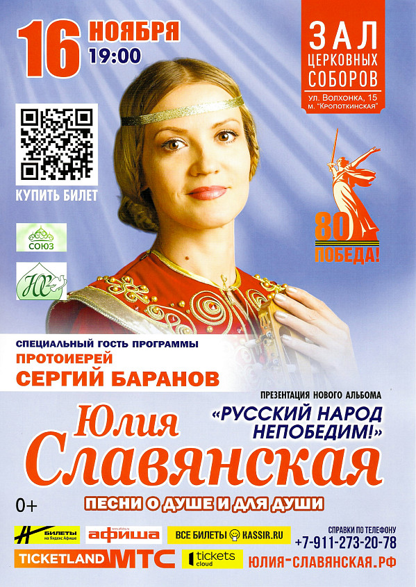 16 ноября 2025 года в Зале Церковных Соборов Храма Христа Спасителя состоится сольный концерт певицы Юлии Славянской “Русский народ непобедим!”