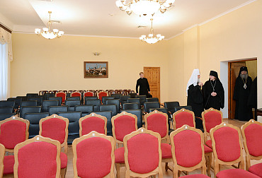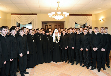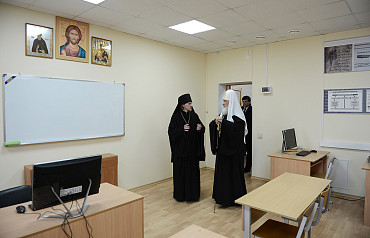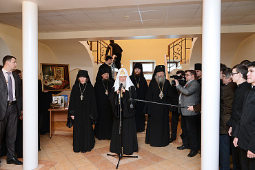 По окончании богослужения Святейший Патриарх Кирилл посетил гимназию имени преподобного Сергия Радонежского при Варницком монастыре.
